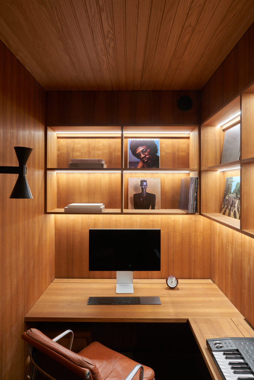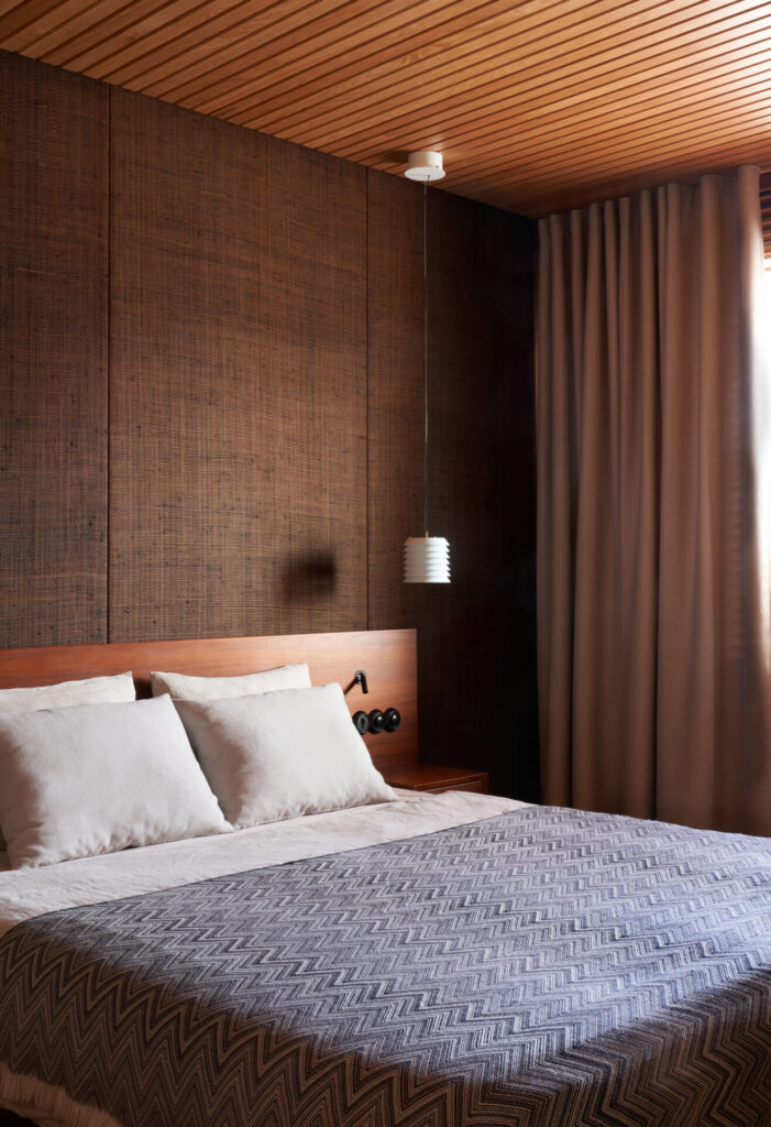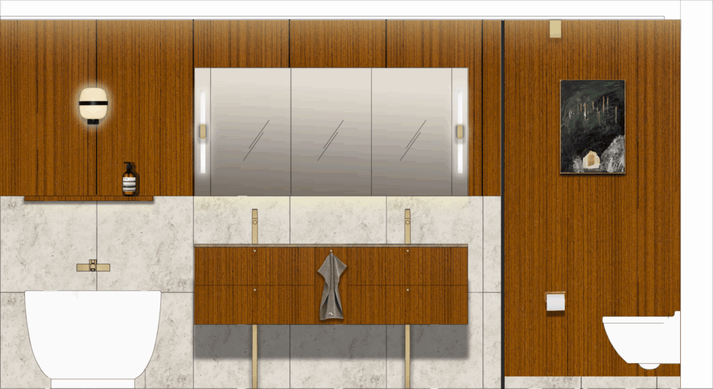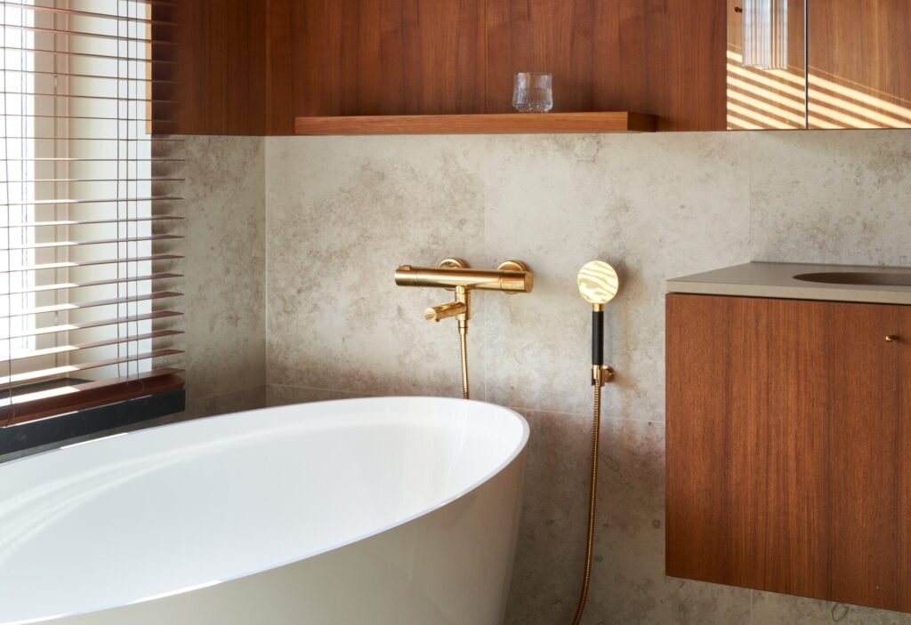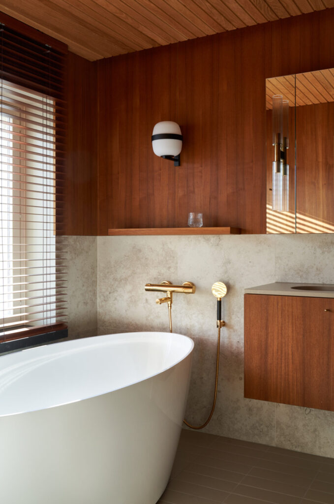 The design concept emphasizes continuity and respect for heritage. Original materiality and detailing informed every decision: oak-paneled ceilings, teak joinery, and bespoke carpentry echo the mid-century Nordic aesthetic. Wall surfaces are finished with Dolomite plaster in muted tones, complemented by natural textiles and wool carpets to create a tactile, layered interior. The bathroom introduces a refined material palette of ceramic tiles, sanitaryware, and brushed brass fixtures, balancing durability with understated elegance.